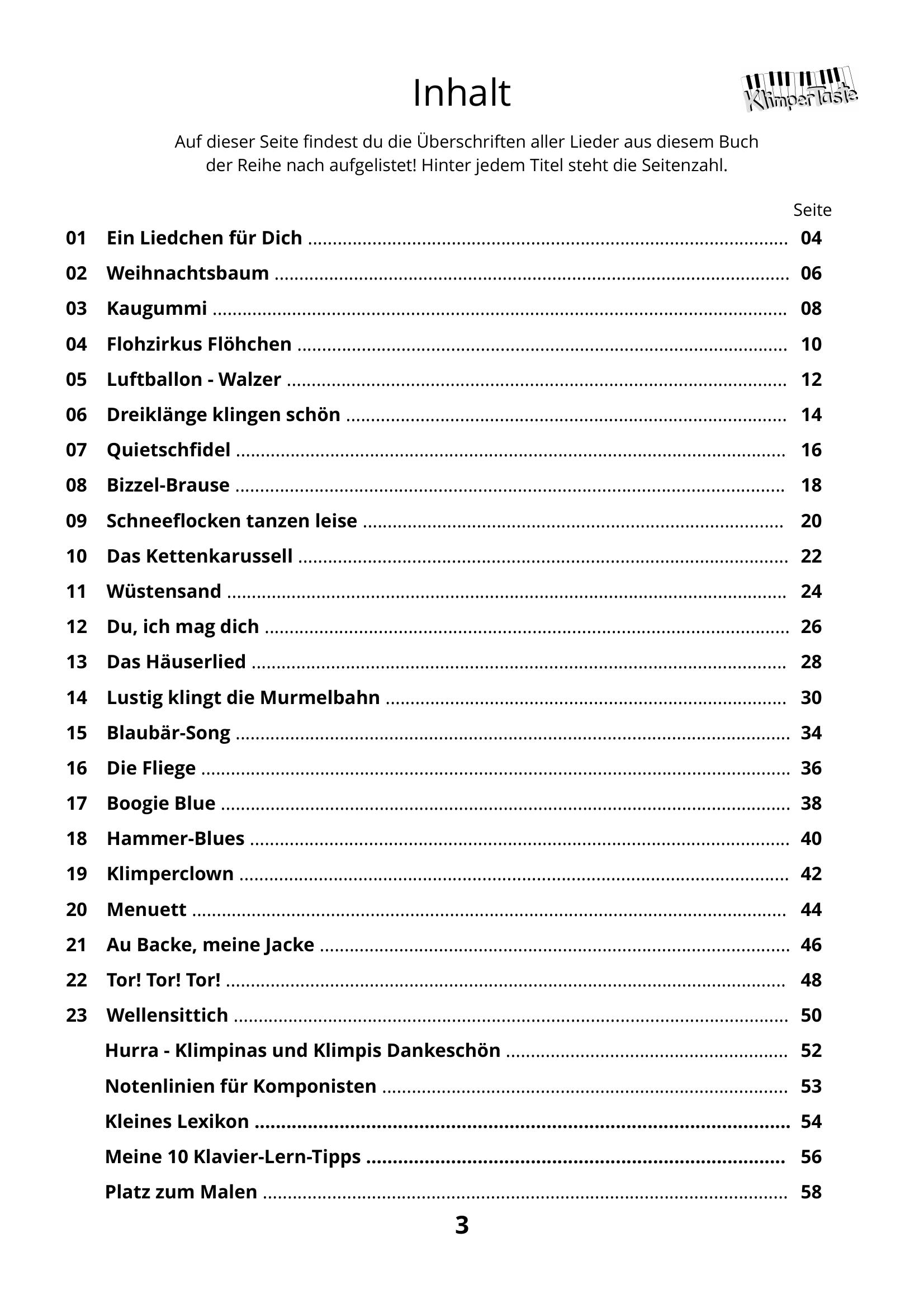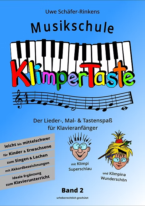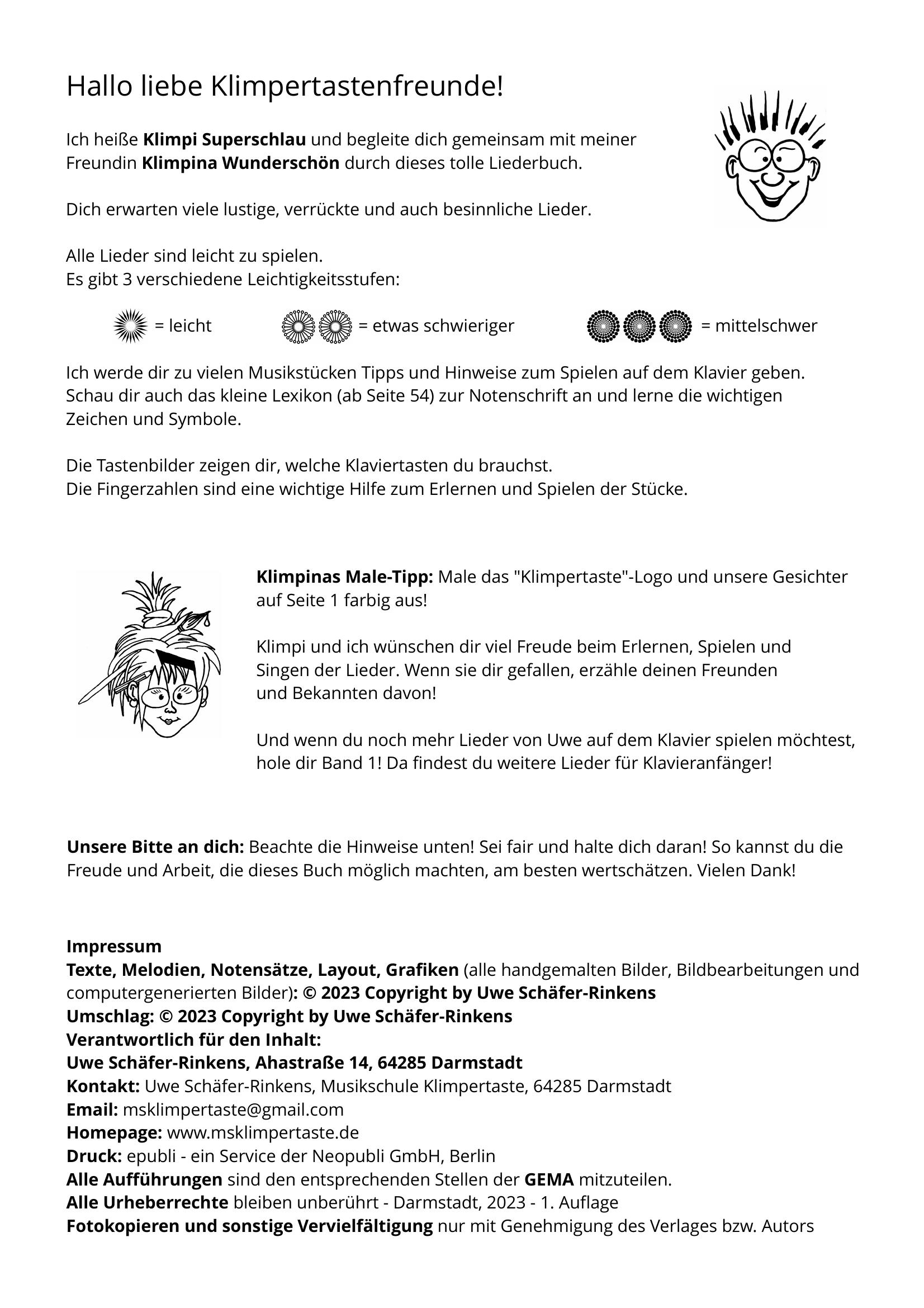 Hallo, ich heiße Uwe Schäfer-Rinkens und lebe in Darmstadt. Wie schön, dass du dich für dieses Liederbuch interessierst! Viele Kinder und Erwachsene lernen bei mir Klavier, Keyboard und Akkordeon spielen. Ich komponiere schöne Klaviermusik und schreibe gerne Lieder zum Lachen und zum Mitdenken. Sie sind ideal für Klavieranfänger und machen viel Spaß! Auch Klavierlehrer/innen können dieses Buch sehr gut als Ergänzung zum Klavierunterricht miteinbeziehen. Die Melodien und Tonarten sind leicht bis mittelschwer. Du lernst mit den Liedern weitere Grundlagen der Notenschrift und des Klavierspielens. Das kleine Lexikon fasst wichtige Zeichen und Regeln zusammen. Meine 10 Spiele-Tipps helfen dir, Anfängerfehler zu vermeiden. Die Akkordbezeichnungen über den Noten verraten dem Musiker, welche Harmonien zur Melodie passen. So kann zum Beispiel ein Gitarrist das Lied auf seiner Gitarre begleiten. Anhören, Mitspielen und Mitsingen kannst du mit Hilfe der Playbacks auf meiner Homepage: www.msklimpertaste.de Klicke dort im „Klimper-Shop“ auf den Pfeil-Button bei Band 2. Du gelangst zu einer Liste mit allen Liedern aus diesem Buch. Hier kannst du dir jeden Titel als Piano-Aufnahme oder als Instrumental-Essemble anhören. Die Bilder in diesem Buch kannst du bunt ausmalen und kreativ gestalten. Ganz besonders freue ich mich über die Tipps, Empfehlungen und Hinweise von Klimpi Superschlau und Klimpina Wunderschön. Ihre Ideen und Tipps werden dir gefallen. Wenn du das Buch gut findest, erzähle es deinen Freunden und spiele ihnen daraus Lieder vor! Herzliche Grüße von deinem Uwe Schäfer-Rinkens